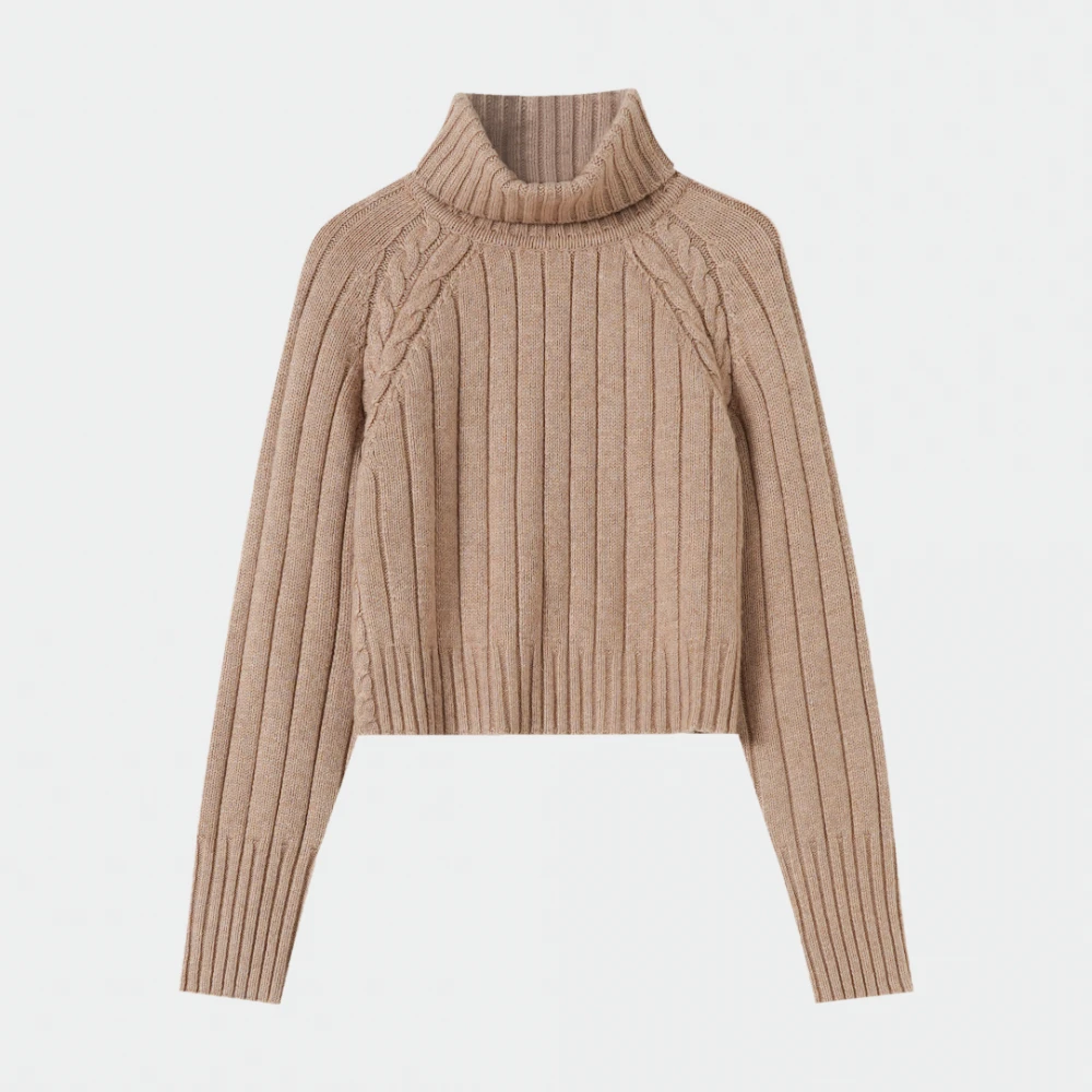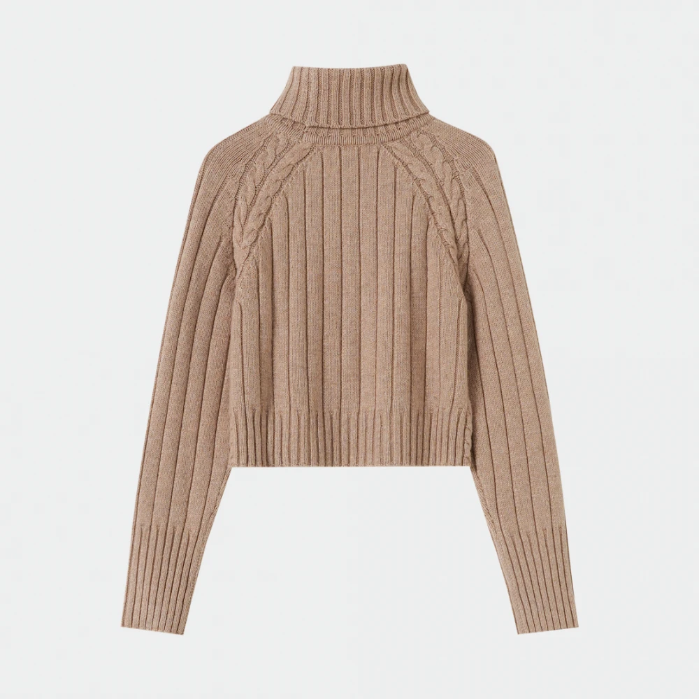 Camel Cable-Knit Ribbed Turtleneck Sweater