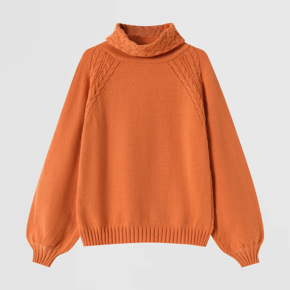 Orange Cable-Shoulder Turtleneck Sweater